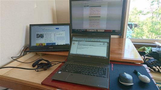 下がDynabook 左がASUS MB168B USBモニター 上が結構前に中古で買ったミツビシの安いモニターです。